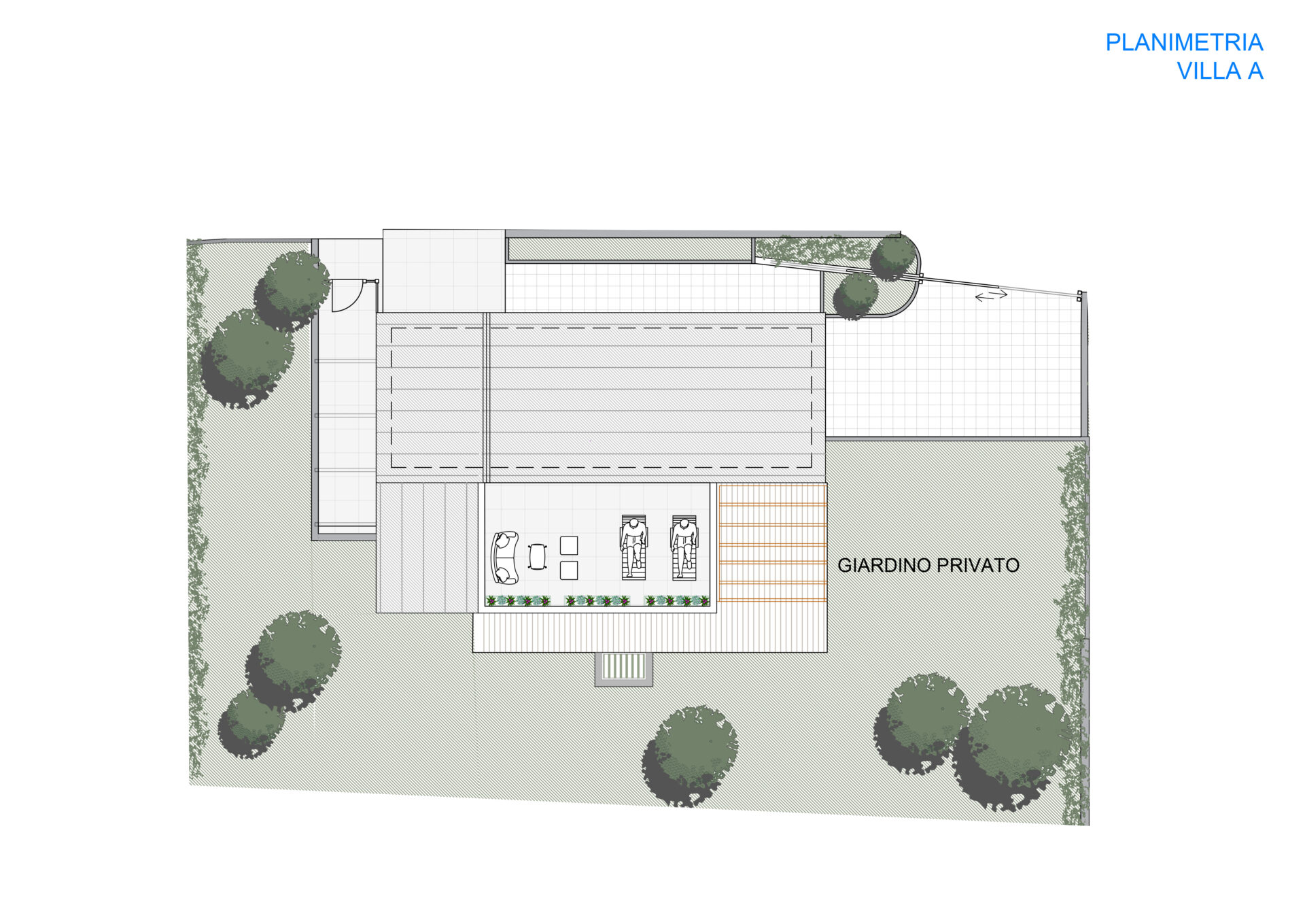 Disposta su più livelli, la villa è circondata da aree pavimentate e da un’ampia area verde che abbraccia quasi completamente l’abitazione, garantendo privacy, tranquillità e spazi ideali per vivere l’esterno in ogni stagione, per accogliere zone living esterne e soluzioni paesaggistiche personalizzate