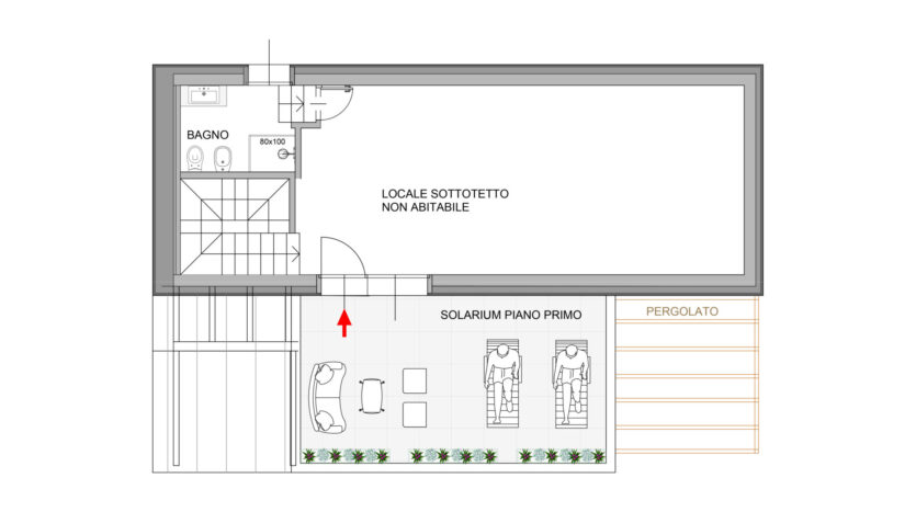 Piano terra: zona ingresso, ampio e luminoso soggiorno con cucina, camera matrimoniale con cabina armadio, disimpegno, bagno e portico con pergolato che collega armoniosamente gli spazi interni all’area esterna.