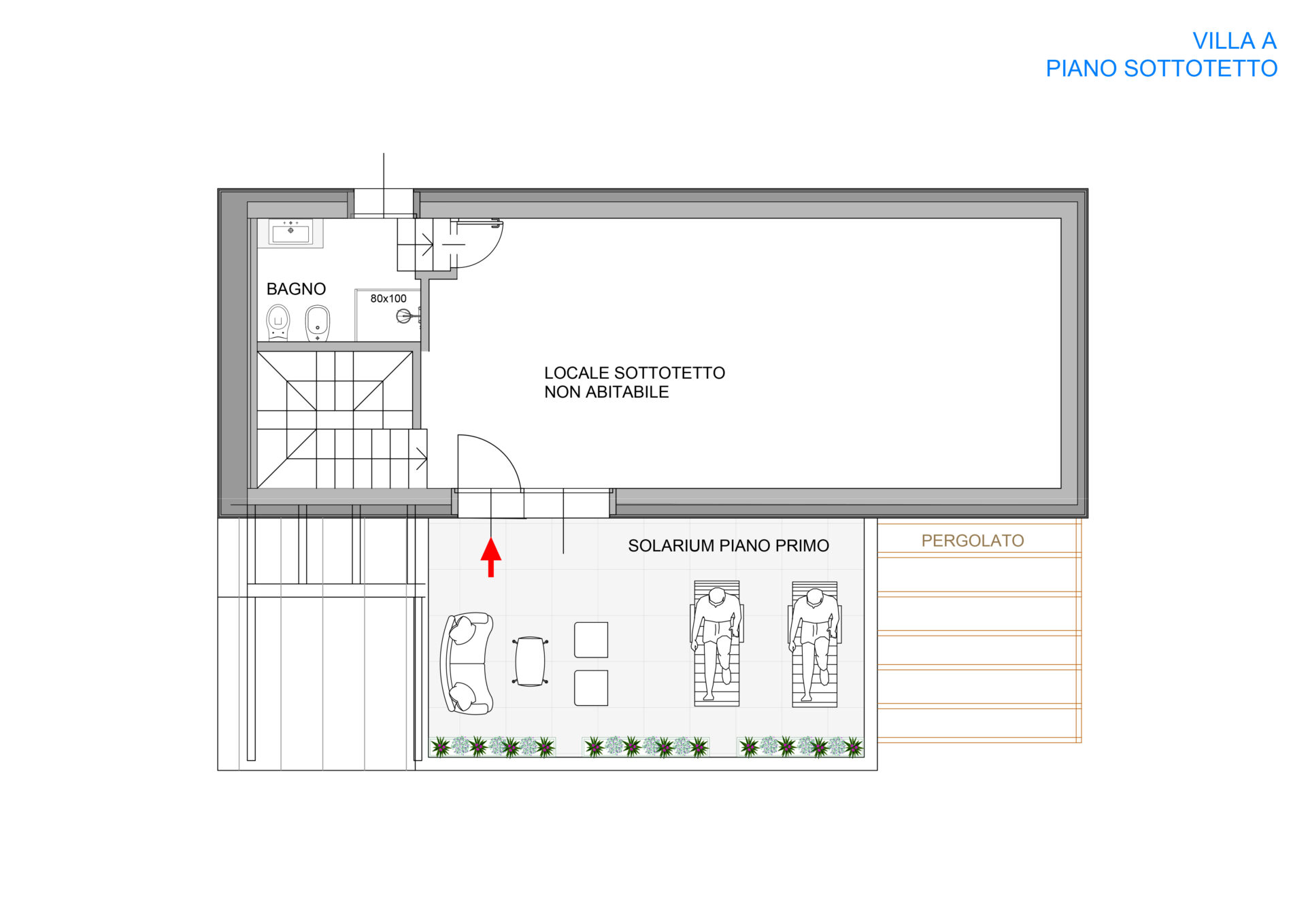 Piano sottotetto: Un ampio e luminoso locale con bagno, perfetto come studio o spazio hobby, con accesso diretto a un grande solarium panoramico, ideale per momenti di relax all’aperto con vista.